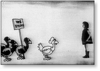 Alice's Egg Plant, 1925: This frame from a very early Walt Disney cartoon when he founded Disney Brothers Studio in Hollywood. His first animation studio was called Laugh-O-Grams and was located in Kansas City. Ub Iwerks was his partner and chief animator. In January, 1924 Walt rented a lot at the corner of Hollywood Boulevard and Rodney Drive for $10 a month for live-action filming of children for the Alice Comedies. | ||